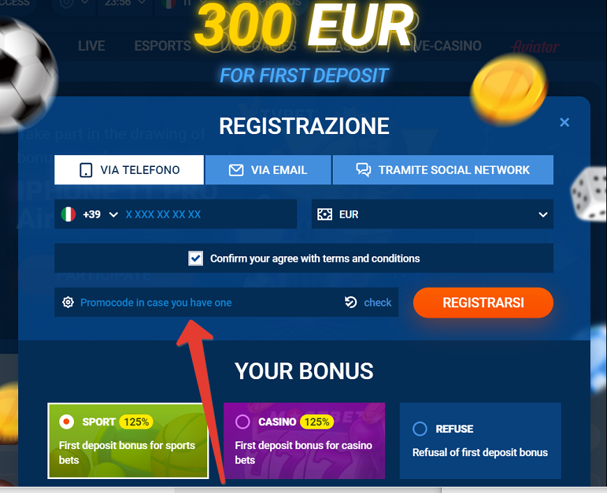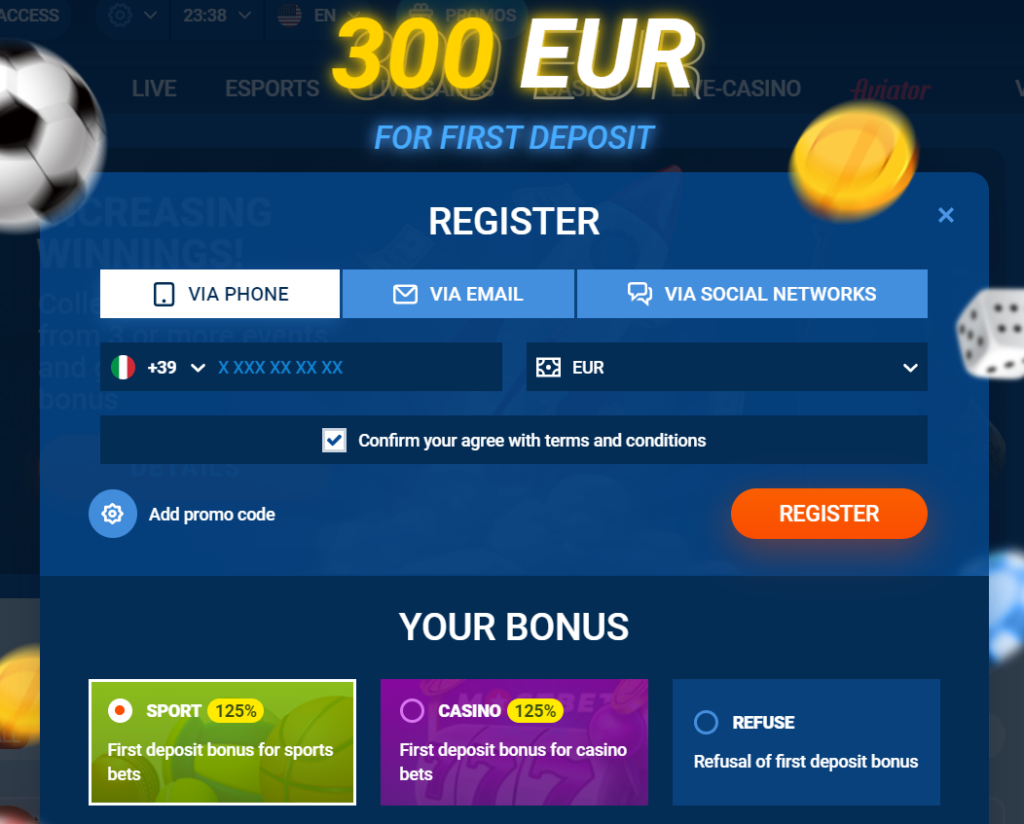 - get a welcome bonus (standard 300 eur from the bookmaker or doubled if you have a promo code).
